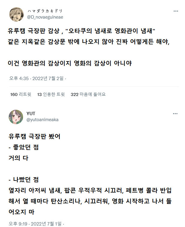 유루캠 극장판 방영당시엔 냄새난다는 말이 실시간 트윗까지올라옴.