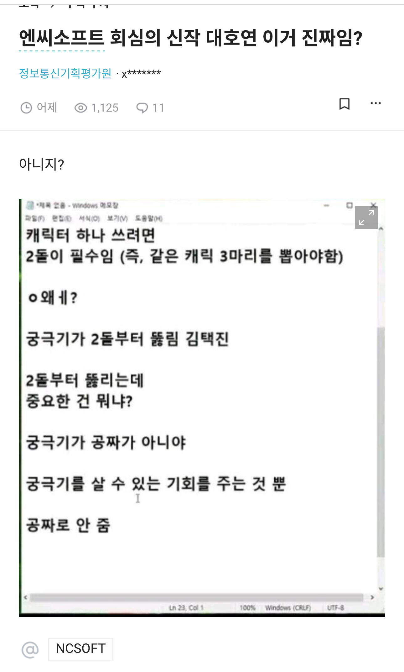 | NC소프트 신작, 호연 반응 근황.jpg (1) | 2024.07.15 |