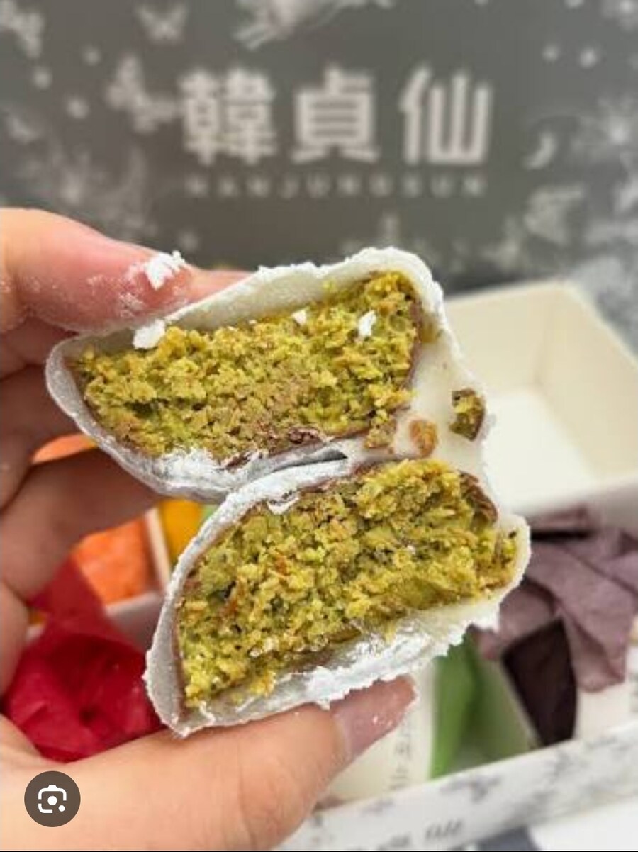 안에는 피스타치오와 잘라넣은 카다이프를 뭉텅이로 넣고 겉에는 마시멜로우와 초코코팅이 씌워 만든 음식으로