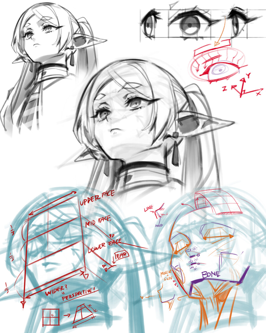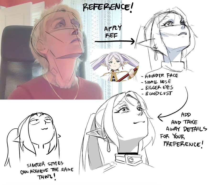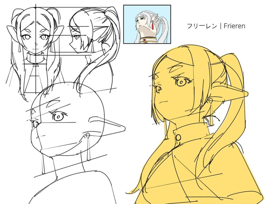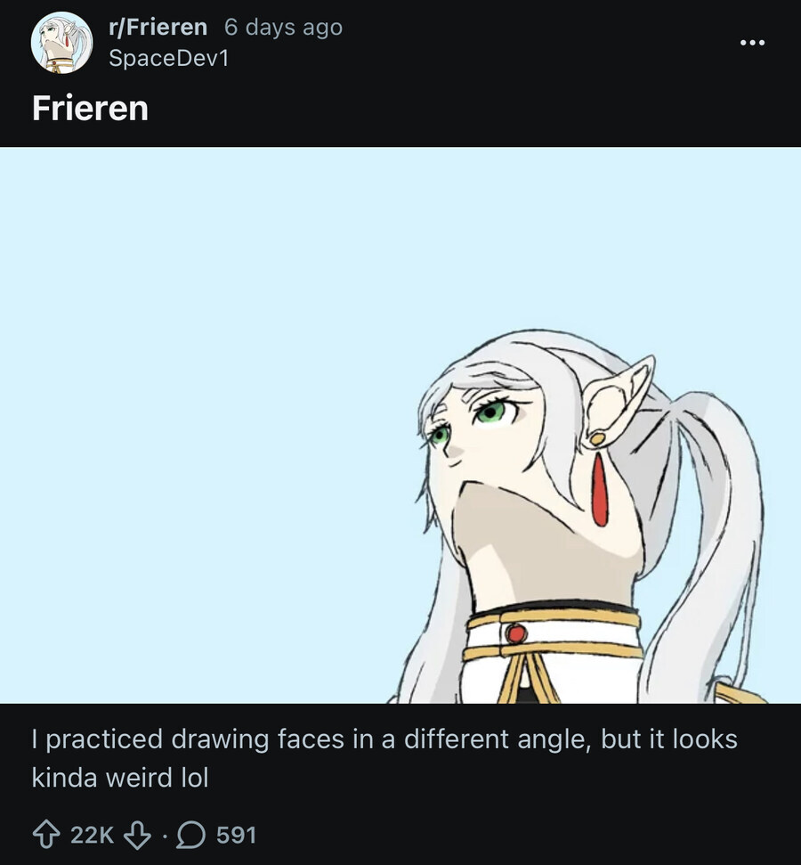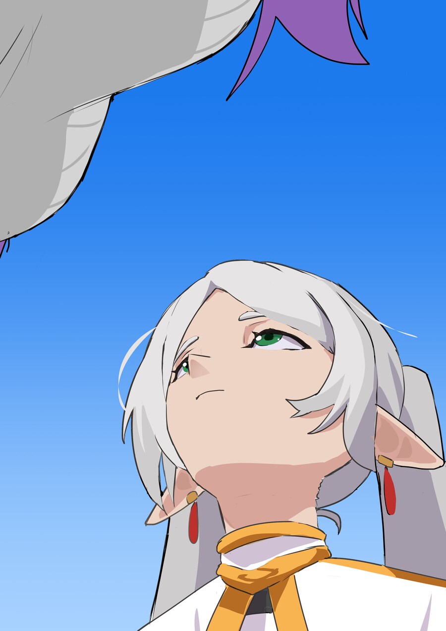 레딧에 올라왔던 프리렌을 그리면서 캐릭터가 아래에서 위를 쳐다보는 로우앵글의 구도가 어렵다는 그림 뉴비